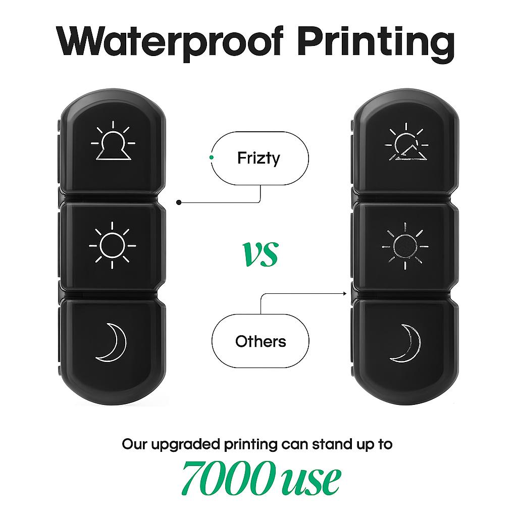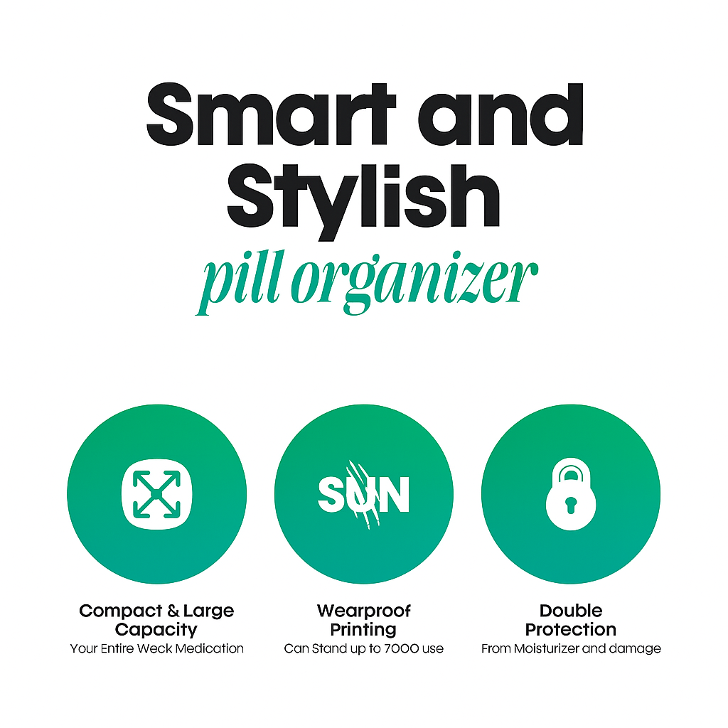 The outer box is crafted from durable, shatter-resistant ABS plastic, ensuring your pills are protected from damage, dust, and spills.