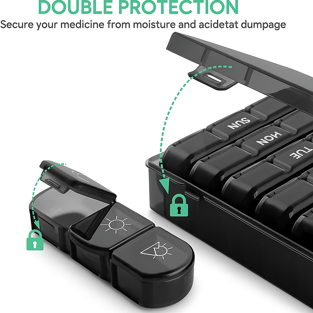 The pill case features double-layer protection with strong snap-lock lids. Your pills stay secure even during rough handling or inside your bag or suitcase.